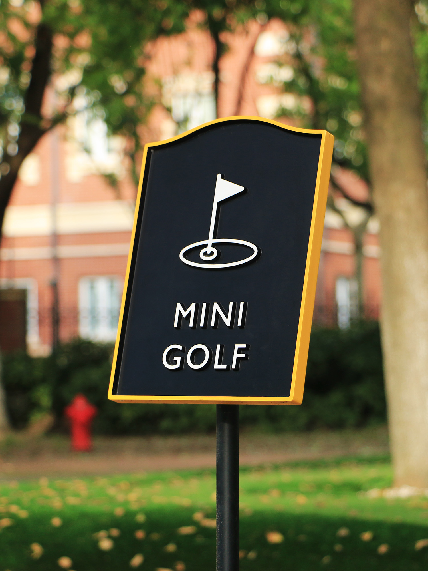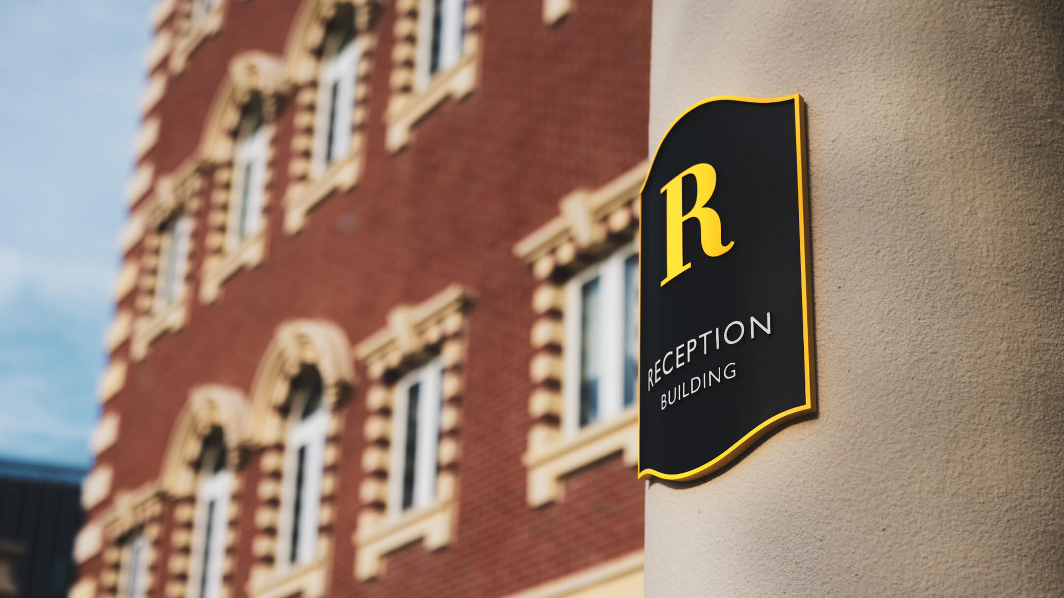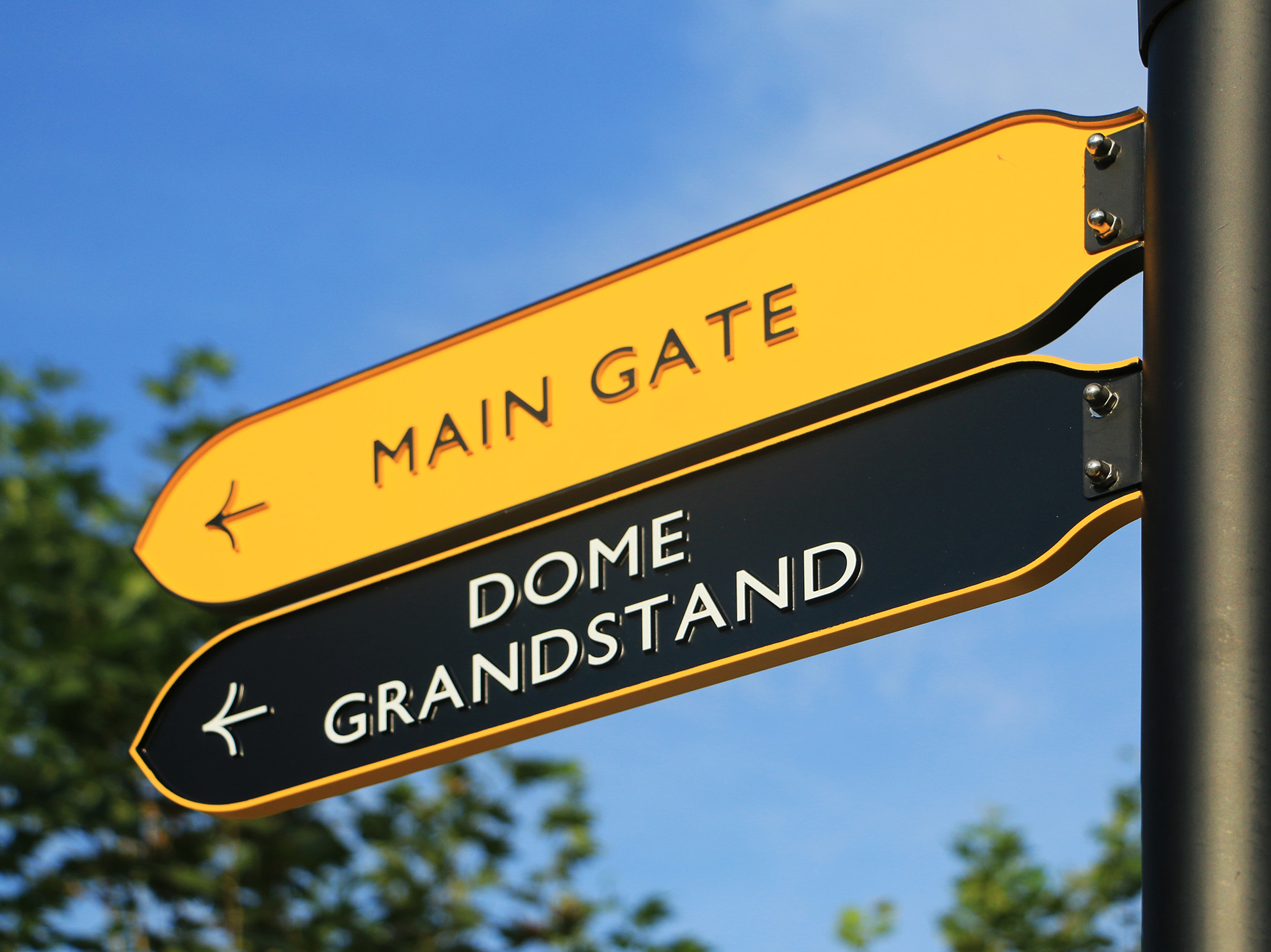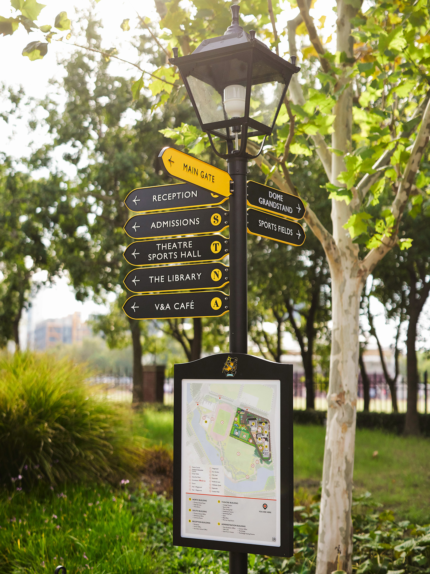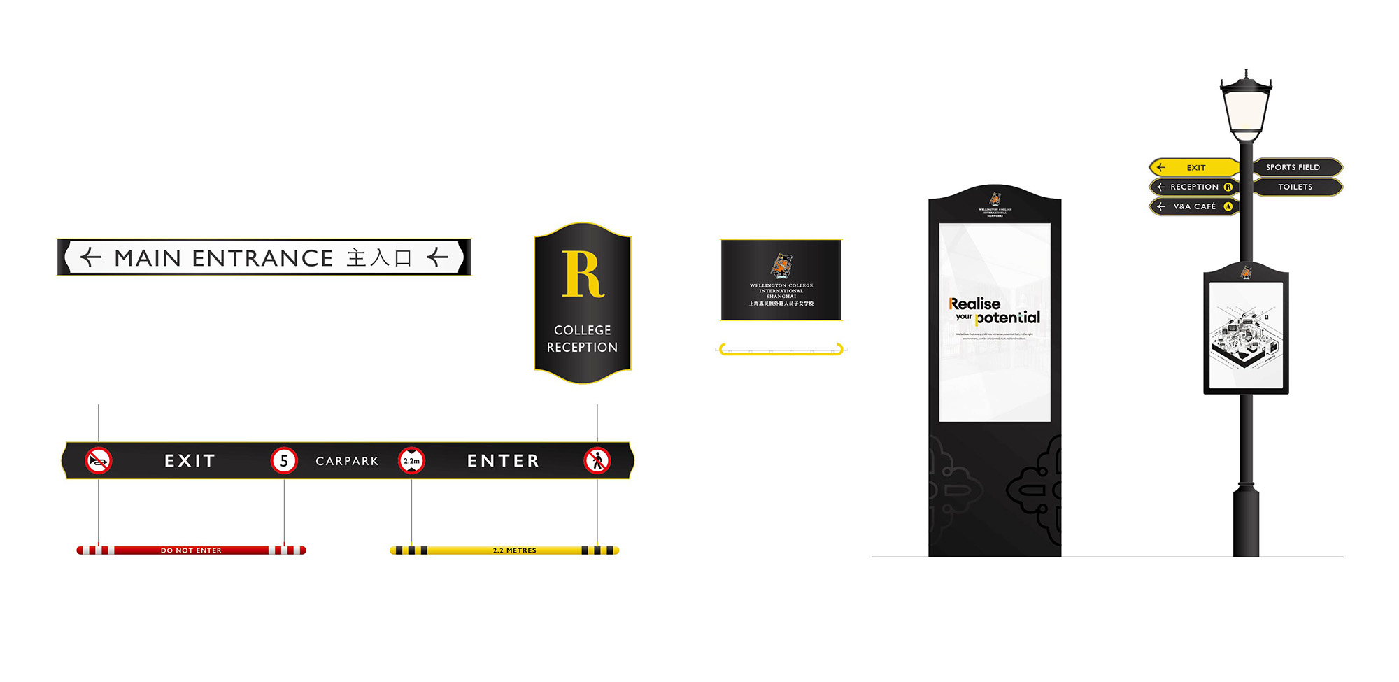 The golden yellow of the College brand, combined with a consistent grid, clear icons, directional arrows and building identifiers, created a distinctive and cohesive visual language across the site. While honouring heritage, the system retains a modern simplicity that complements the diversity of the campus architecture, from historic references to the state-of-the-art sports dome.